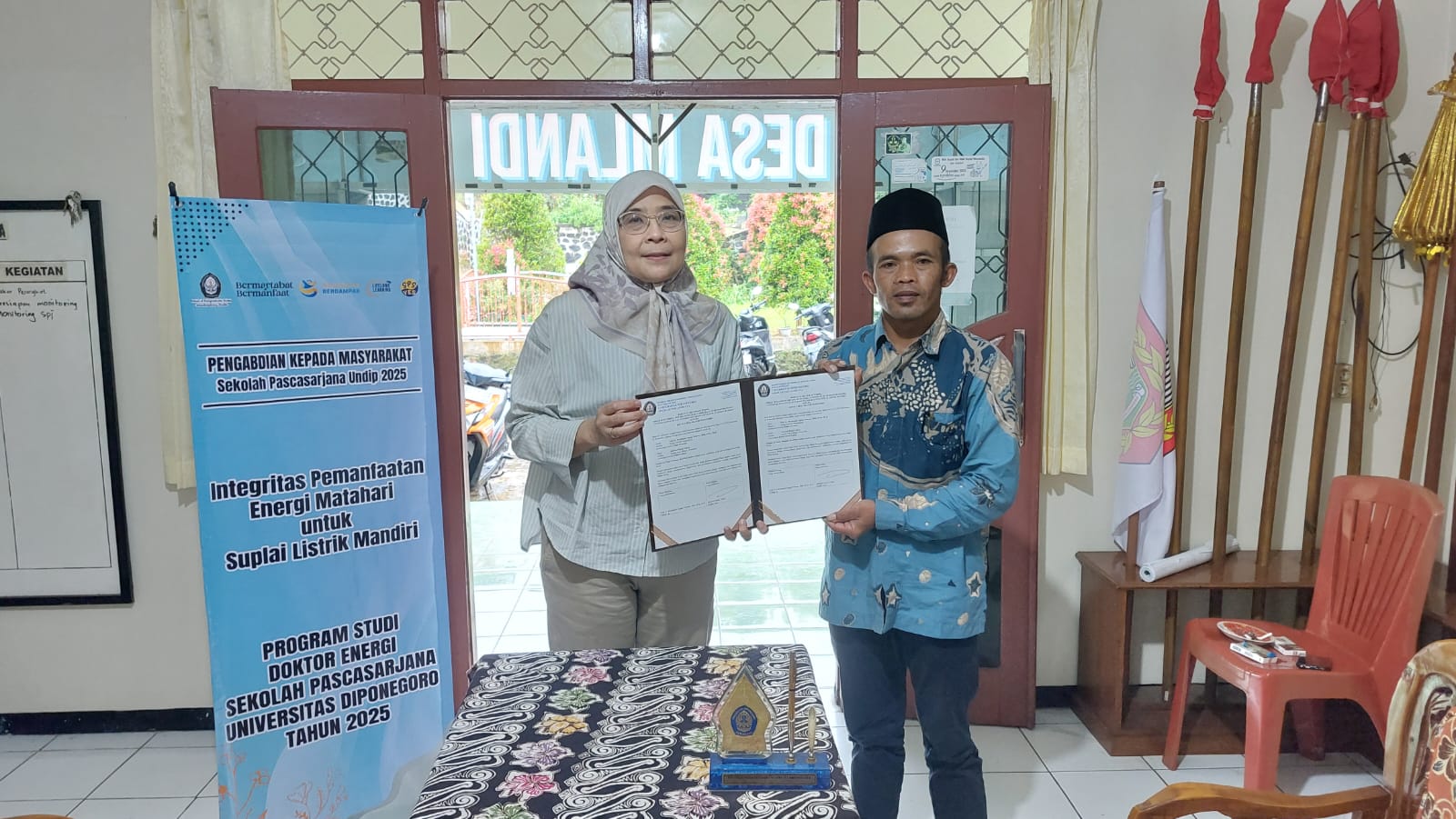 Wonosobo, Jawa Tengah (4/12/2025) — Dalam upaya memperluas akses energi bersih di pedesaan, Sekolah Pascasarjana Universitas Diponegoro mengadakan penyerahan dan penandatanganan teknologi perangkat panel surya kepada masyarakat Desa Mlandi, Kecamatan Garung, Wonosobo pada Kamis, 4 Desember 2025. Kegiatan ini ditujukan untuk mendukung penerangan fasilitas umum desa serta meningkatkan efisiensi energi di lingkungan masyarakat serta mewujudkan […]