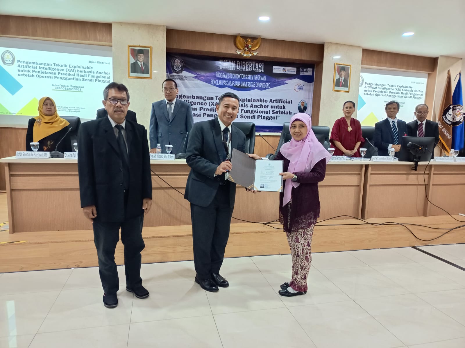 Undip, Semarang (18/09/2025) – Sekolah Pascasarjana Universitas Diponegoro kembali menyelenggarakan ujian disertasi bagi mahasiswa Program Studi Doktor Sistem Informasi. Kali ini, giliran penelitian dari Intan Yuniar Purbasari dengan disertasi bertajuk “Pengembangan Teknik Explainable Artificial Intelligence (XAI) Berbasis Anchor untuk Penjelasan Prediksi Hasil Fungsional Setelah Operasi Penggantian Sendi Pinggul”. Ujian ini berlangsung di Ruang Sidang Lantai 2, Gedung TTB-B, Sekolah Pascasarjana Universitas